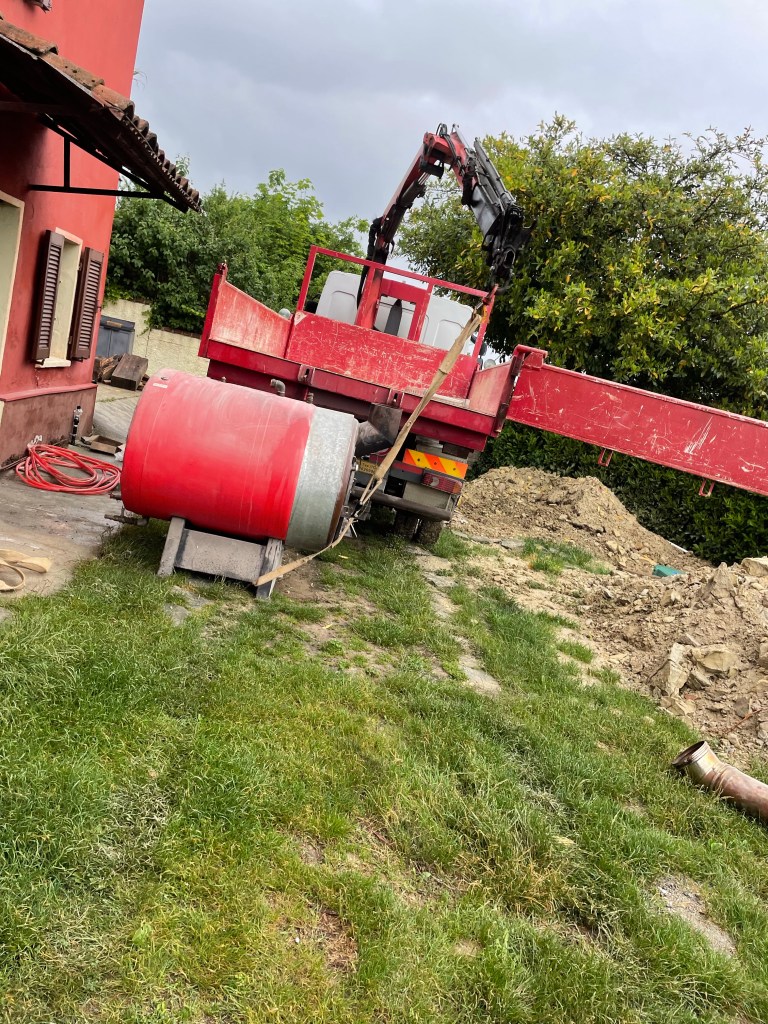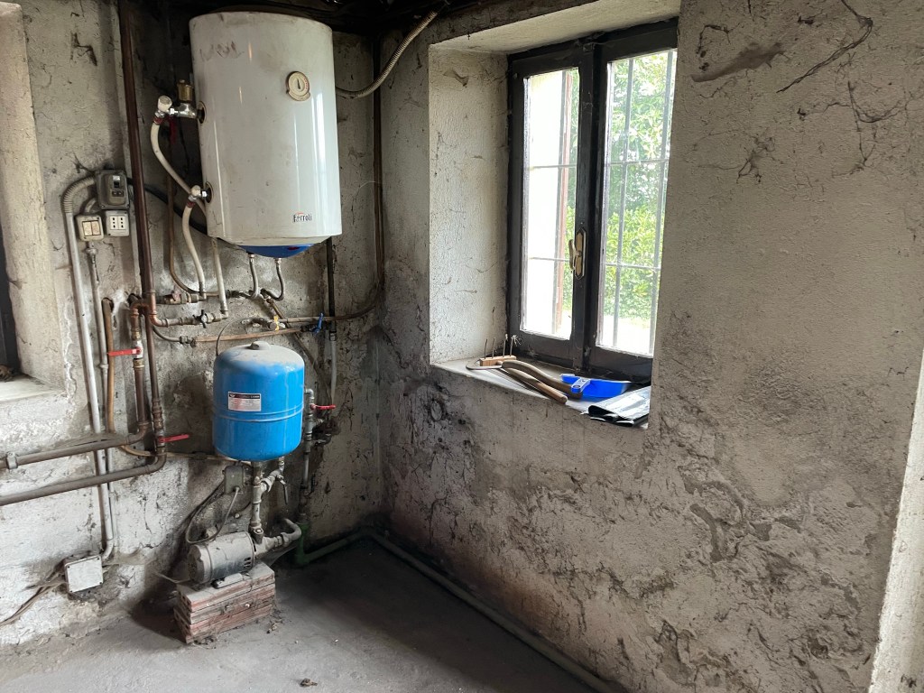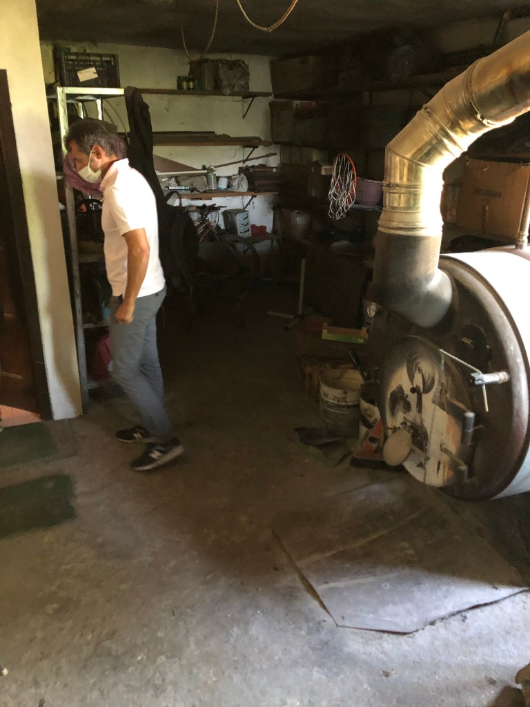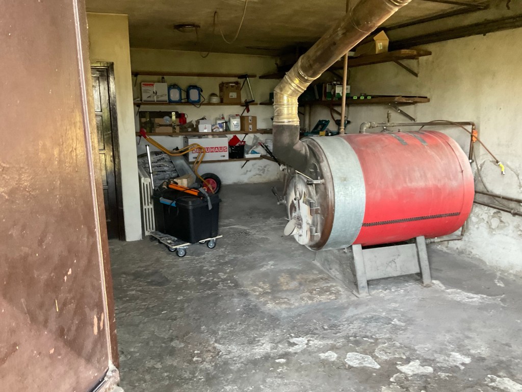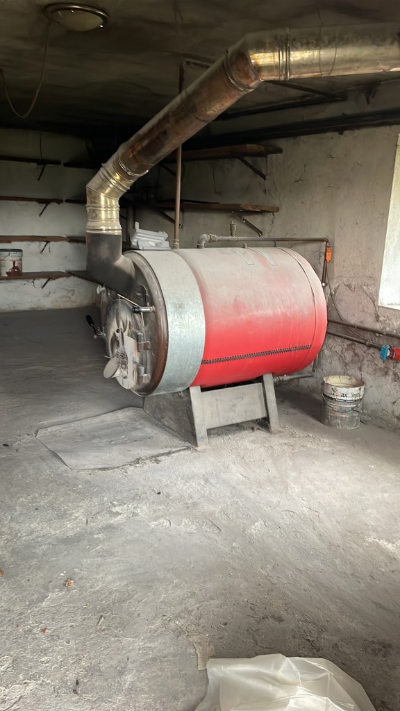 Vores fyrrum er sort af sod. Der stod et kæmpe brændefyr da vi overtog. Da vi ikke kan holde huset frostfrit fra dk ved hjælp af brændefyr, skulle det fjernes.