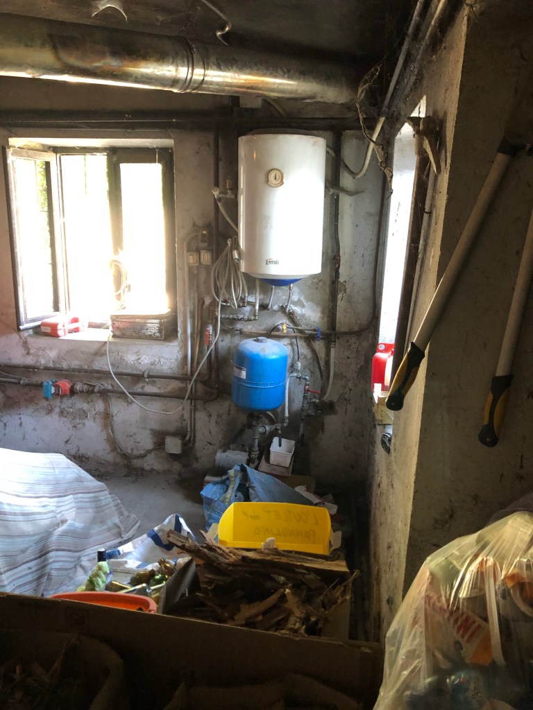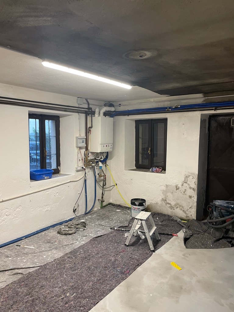 Imens vi ventede på at kunne gå videre med badeværelset, begyndte vi at male og vaske lidt af i fyrrummet. Der er såååå meget sod, ved ikke om vi nogensinde kommer det helt til livs, men idet mindste lugter det ikke mere. Vi blev ikke færdig med at male, det gode er, at vi ikke er i tvivl om, hvor vi er nået til.
