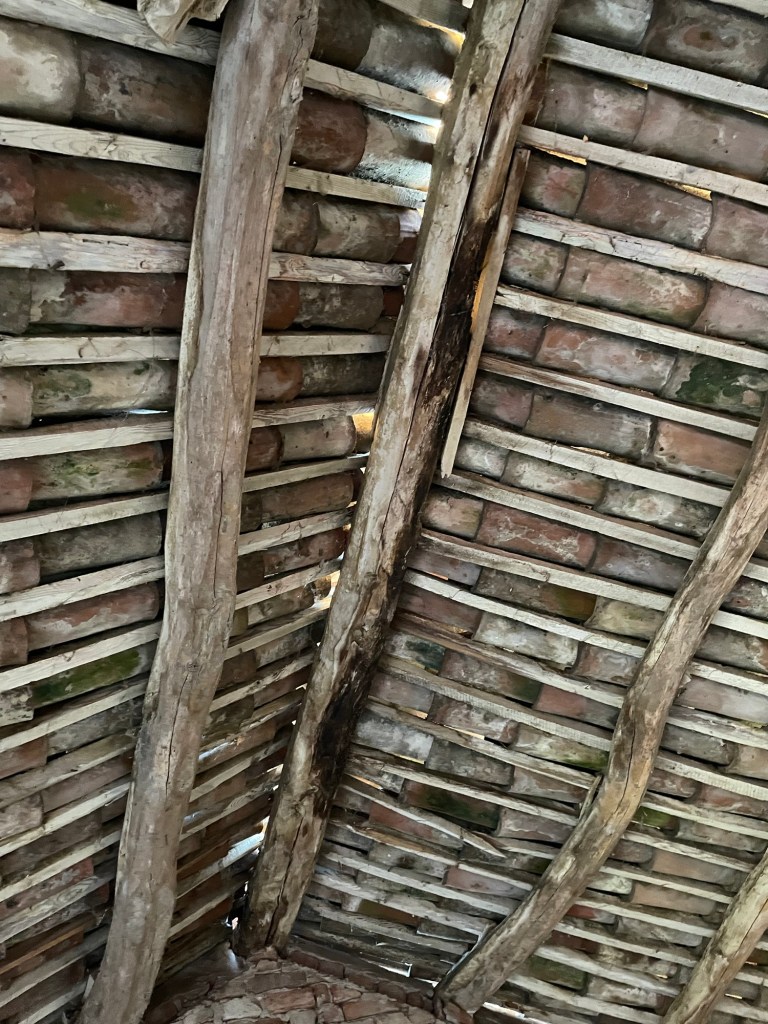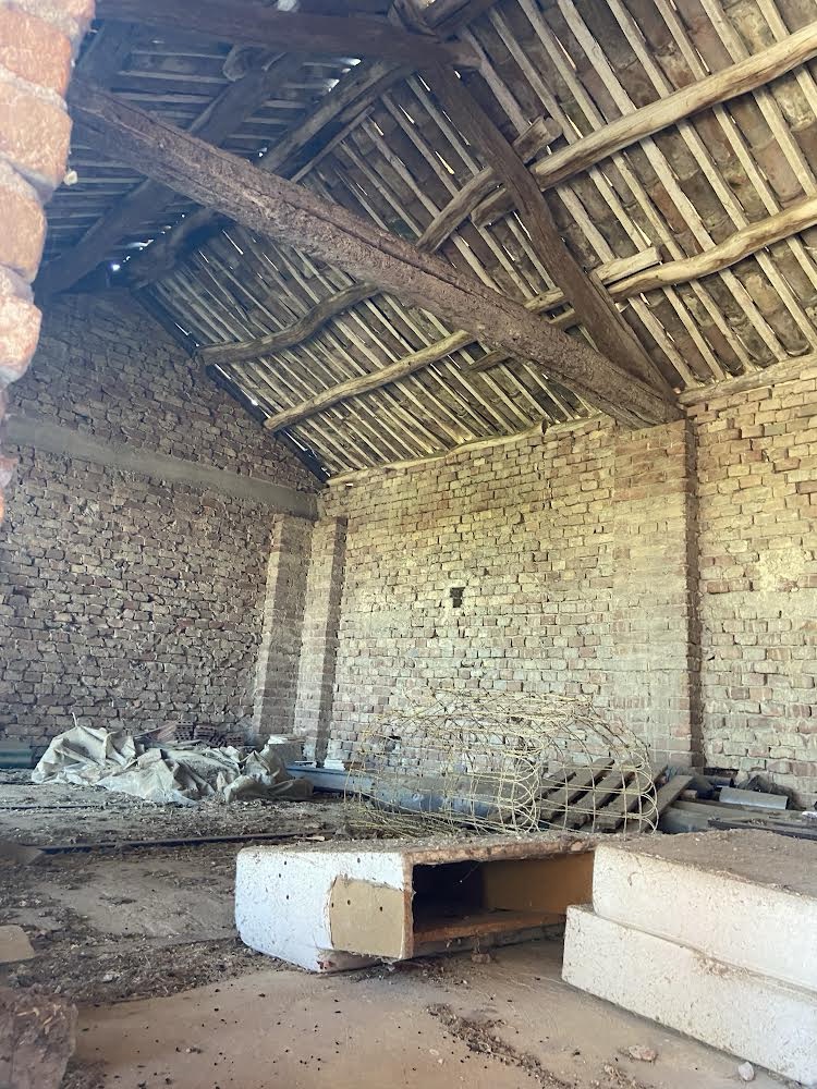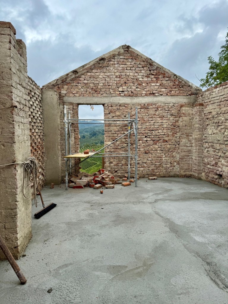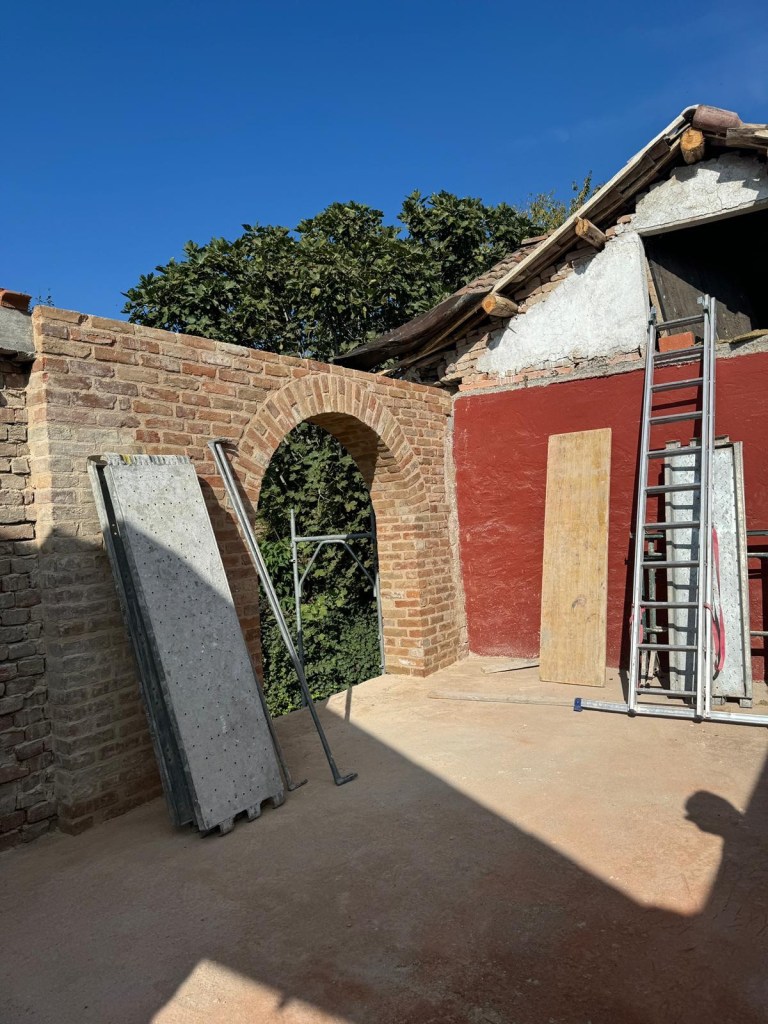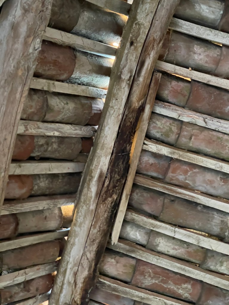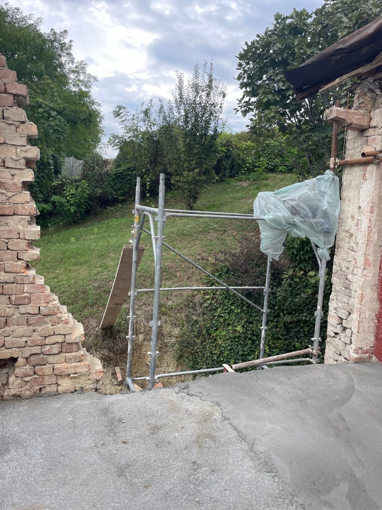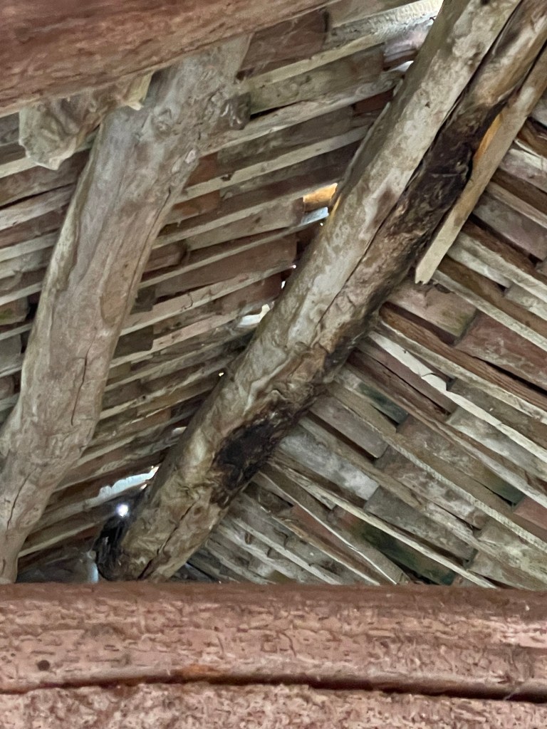 Høloftet har vi kun kunnet tilgå via en jern trin på huset. Det har engang været åbent på bagsiden og i gavlen. Nu får vi åbnet igen, væggen på bagsiden var alligevel ved at vælte, da de ikke havde bygget den i forbandt med den gamle mur på huset.