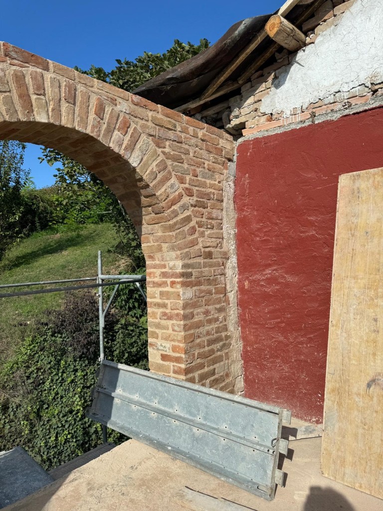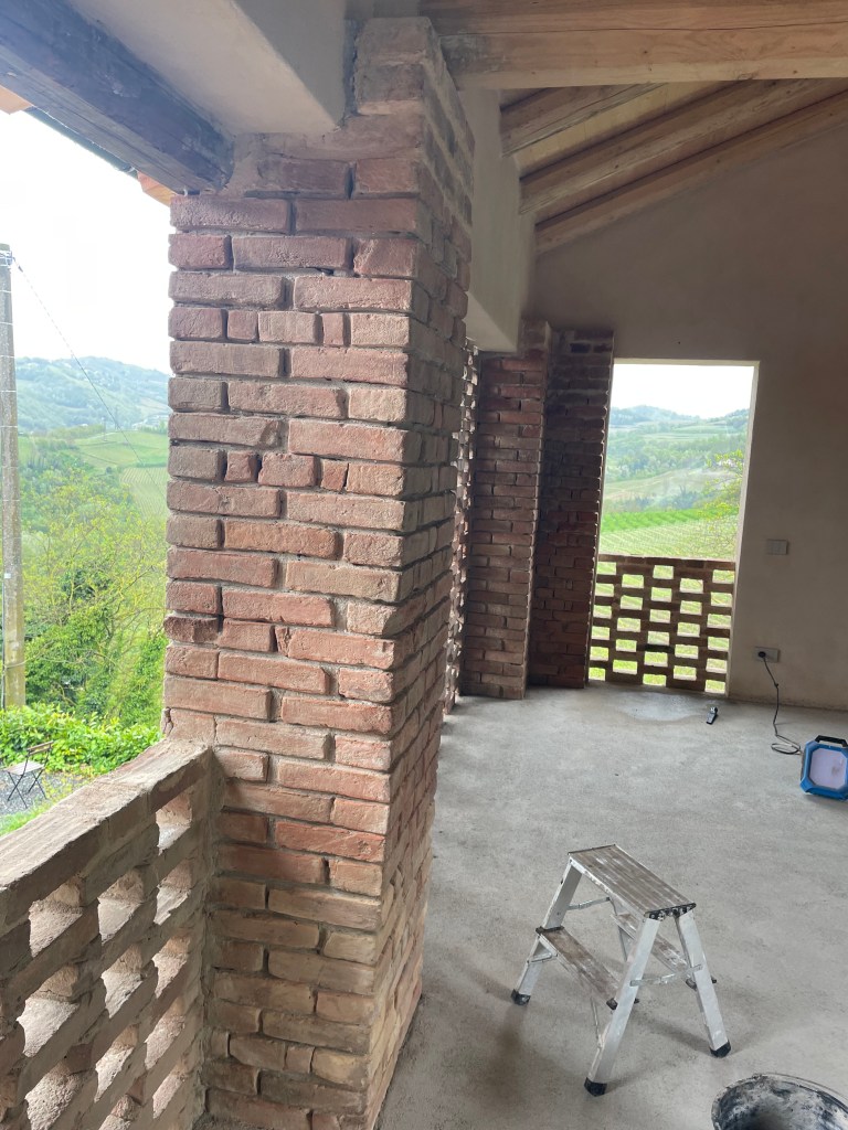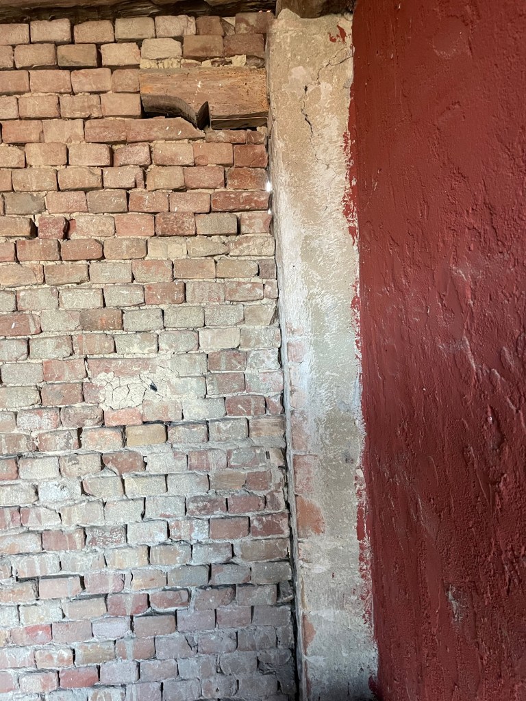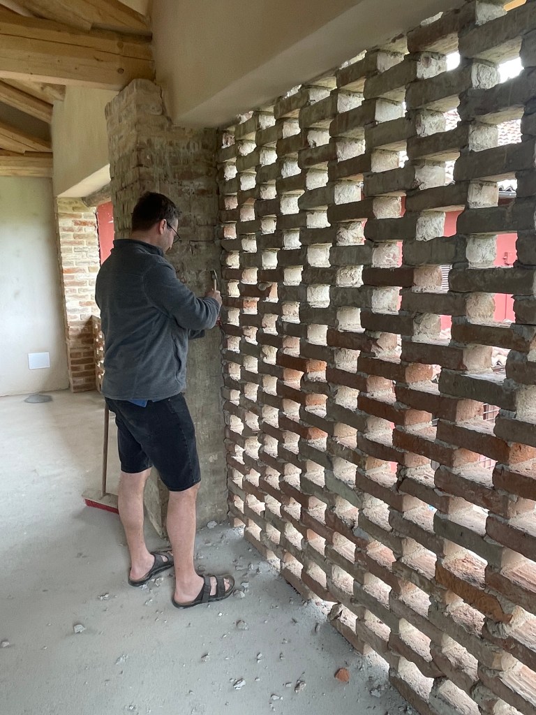 Vi har nu renset fuger og mursten for gammelt puds på høloftet. Fuget igen, med det originale kalk mørtel – selvfølgelig. Vi har renset gammelt cement af hul muren – det er blevet mega flot og vi er rigtig glade for resultatet.
