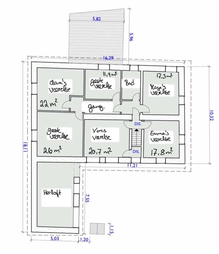 Det sidste soveværelse er som værelse nr. 6, er heller ikke godkendt. Det er et skønt stort værelse, som skal have en dobbeltdør ud til ladens 1 sal.