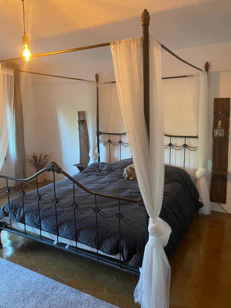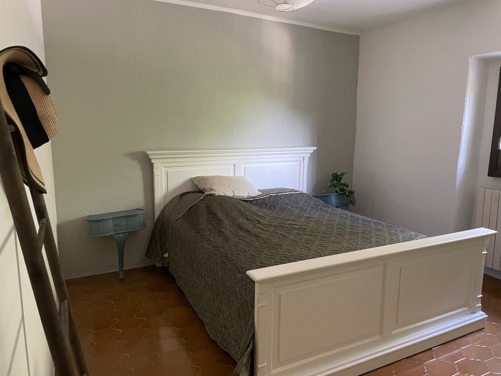 1 værelse på højrehånd er et dejligt stort soveværelse. Der er et mørkt parketgulv på lige nu, da fliserne under er skulle være temmelig ødelagt. Trægulvet skal af og nye fliser skal på. Værelset er en del af det oprindelige hovedhus. Vi undre os over, at der ikke er buer i loftet. Måske de er gemt.