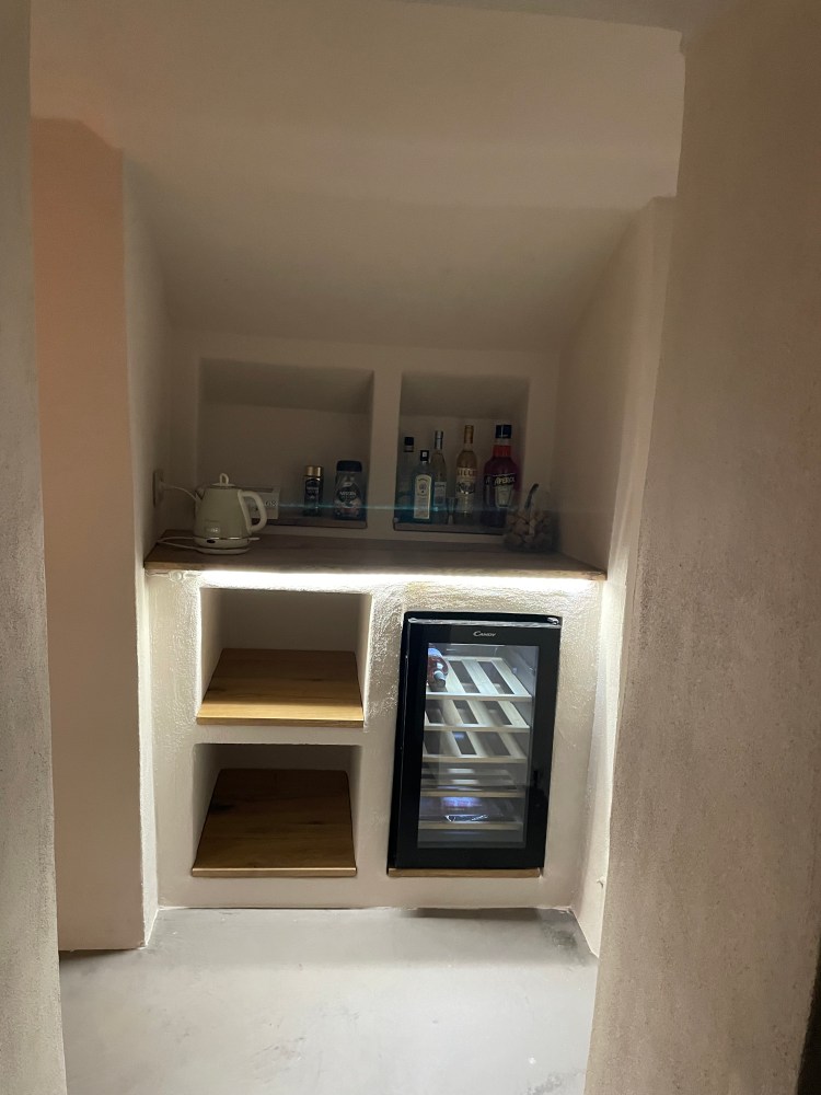 Væggene er ikke kønne. Pudsen er noget de kalder plastico, og er ikke diffusions åbent. Vores arkitekt anbefaler det kommer af, og laves om. så vi kan desværre ikke “bare” spartle ovenpå.